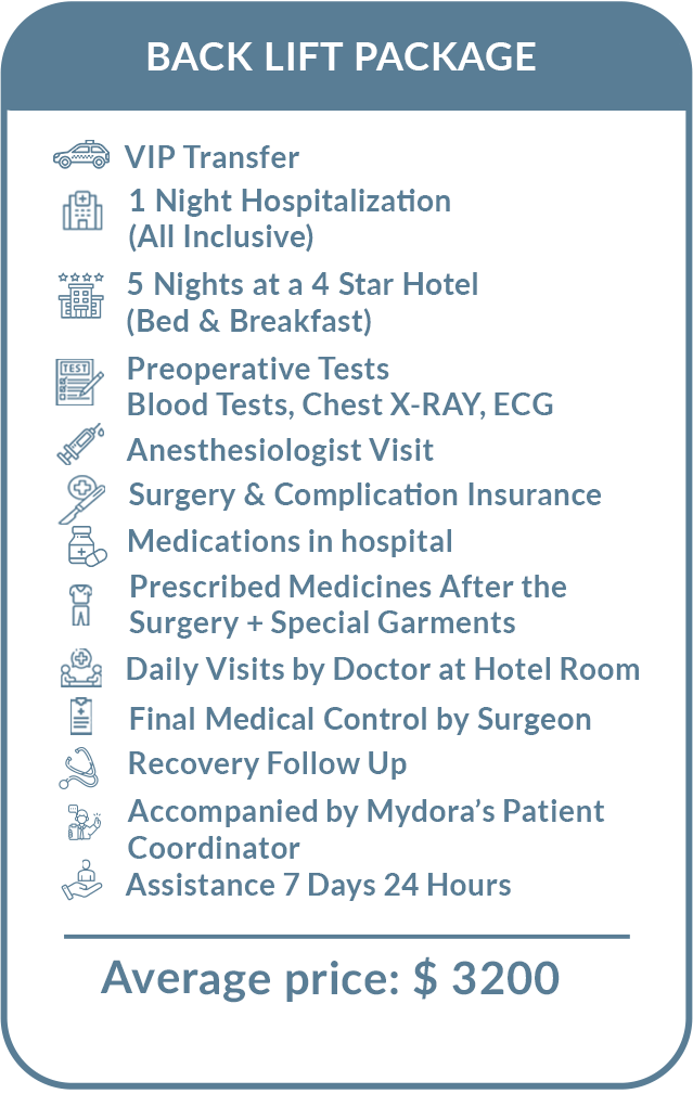 The overall cost of back lift in Turkey changes according to experience of your surgeon, and hospital. The price ranges from $3300 to $4300. If you are not happy with the excess skin in your back, get your back lift in Turkey! Turkey provides best healthcare service with affordable prices compared to Europe, United States and UK!