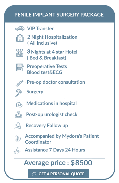 In Turkey, penile implant surgery packages typically start from $7000-$13000 depending on the clinic, surgeon experience, and implant type (malleable or inflatable).