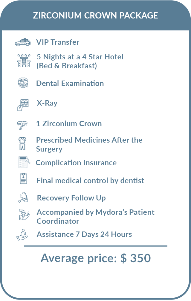 Zirconium Crown procedure in Turkey typically costs between $350 and $600. It’s important to keep in mind that these costs are estimates and that the exact amount will change based on the desires of each patient, dentists’ experience and clinics. Compared to the UK, United States, and Europe, Turkey provides more affordable treatment packages for Zirconium Crown procedures.